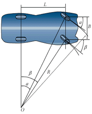 为使汽车在转向时减少附加阻力和轮胎磨损,汽车转向时各个车轮都应做纯滚动,此时各轮的轴线必须相交于一点,见图1。交点O称为转向中心。该中心随驾驶员操纵前轮转角的变化而改变,因此也称为瞬时转向中心。由图中可看出,这时汽车的内转向轮偏转角β大于外转向轮偏转角α,两者的关系时: