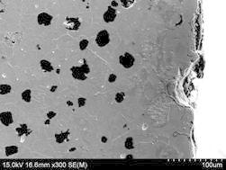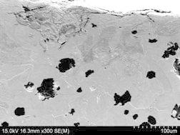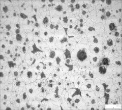 在断口2号试件横向截取试样,试样经镶嵌、磨制、抛光,在未经侵蚀的情况下观察试样的球化级别和石墨大小。根据GB/T9441-2009《球墨铸铁金相检验标准》石墨球化级别为3级,石墨大小为6级,见图4、图5所示。用4%硝酸酒精溶液腐蚀观察组织,在金相显微镜和扫描电镜下观察。该转向节所用的材料基体组织为铁素体球墨铸铁,珠光体数量为24B,见图6、图7所示。在试样的四周边缘区域有0.1mm左右的珠光体层,此外在四周边缘存在大量的缺陷,有表面加工痕和夹杂物等;经能谱成分鉴定,有大片状石墨裂纹、硫化物夹杂、氧化铝夹杂、氧化硅、氧化铁以及孕育剂熔解不充分而形成的大块的深而尖的裂纹表面缺陷,见图8、图9。